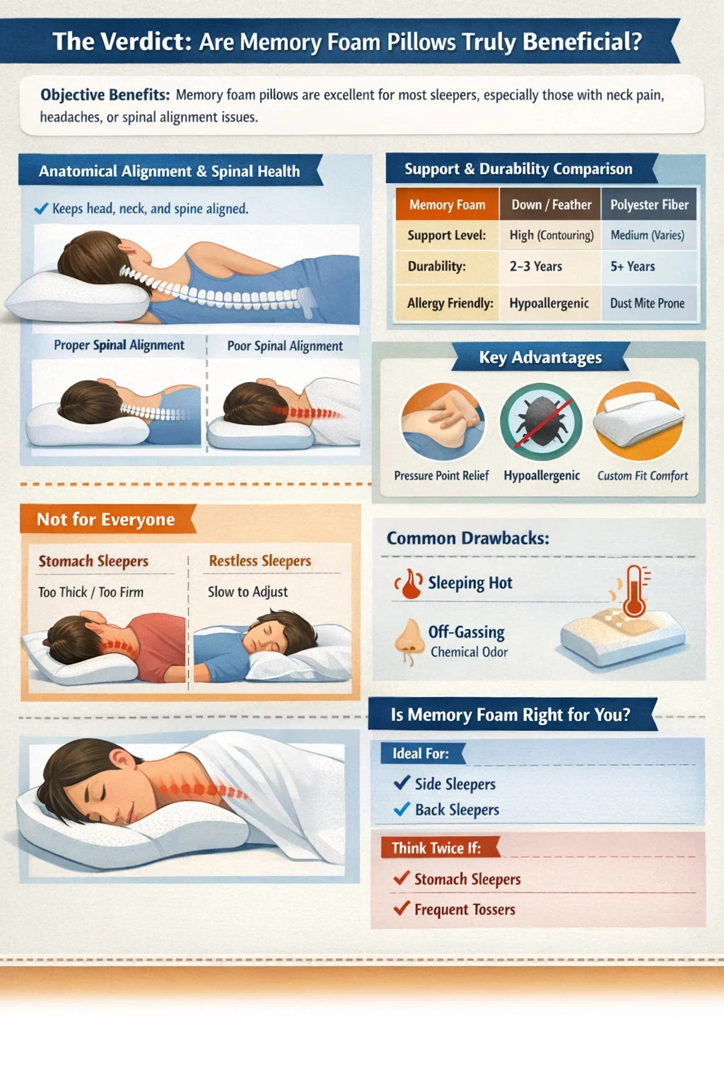 Aj keď ponúkajú významné ortopedické výhody, nie sú univerzálnym všeliekom. Ich „dobro“ závisí vo veľkej miere od vašej osobnej polohy pri spánku, tolerancie tepla a citlivosti na materiálové pachy. Pre spanie na boku alebo na chrbte môže byť vankúš z pamäťovej peny a transformačný nástroj na hygienu spánku , zatiaľ čo spáč v žalúdku ich môže považovať za príliš obmedzujúce alebo pevné.