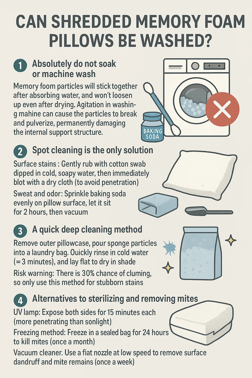 Vyberte vonkajší vankúš a nalejte špongiové častice do vrecka na bielizeň. Rýchlo opláchnite v studenej vode (≤ 3 minúty) a v tieni ležte rovno do sucha (nevystavte sa priamemu slnečnému žiareniu alebo bubnovej sušičke).