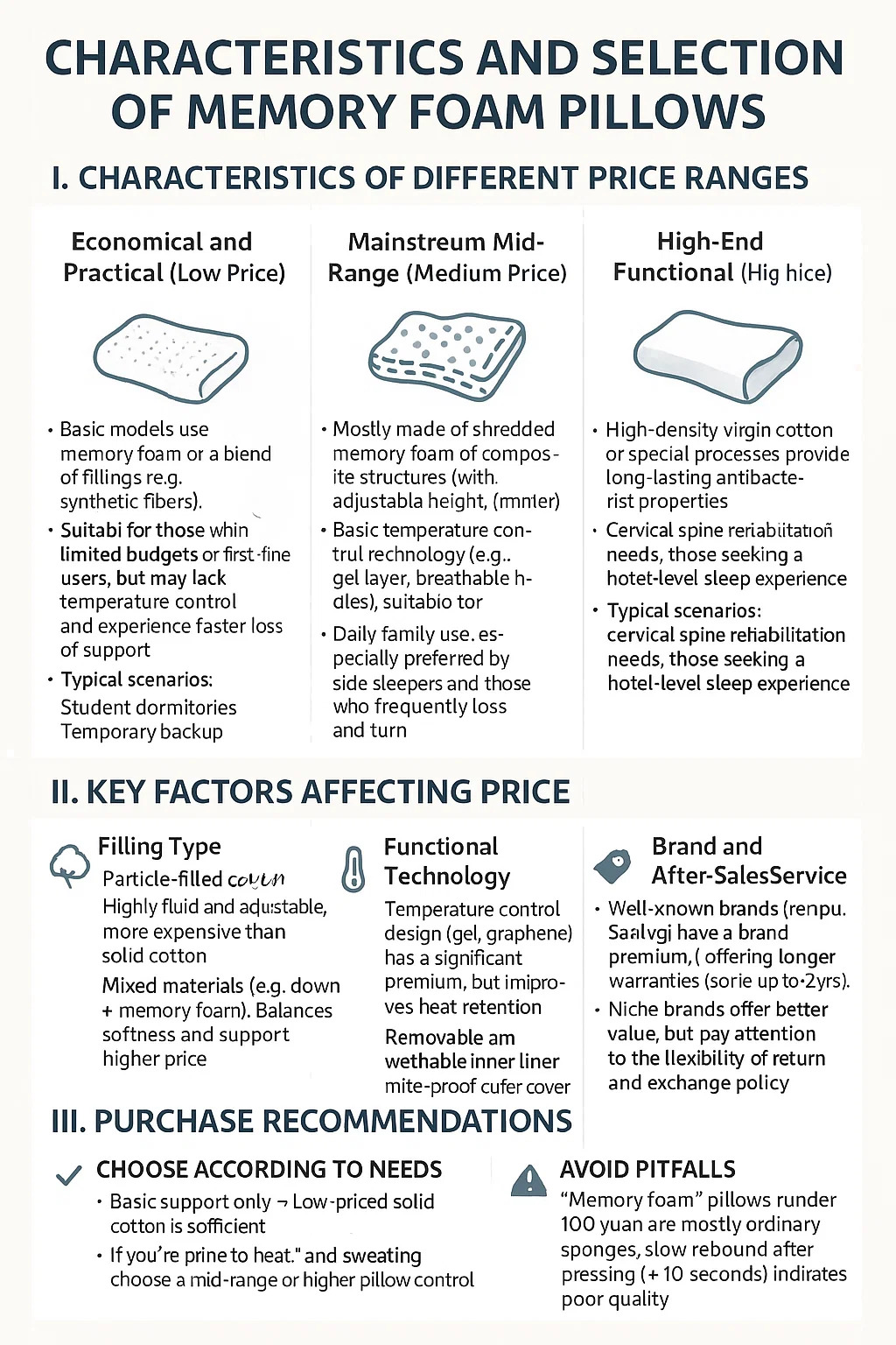 Vankúše z pamäťovej peny sa značne líšia v cene, primárne ovplyvnené materiálmi, funkciami, značkou a dizajnom. Nižšie je uvedené stručné vysvetlenie bežných cenových rozsahov a ich zodpovedajúcich charakteristík: