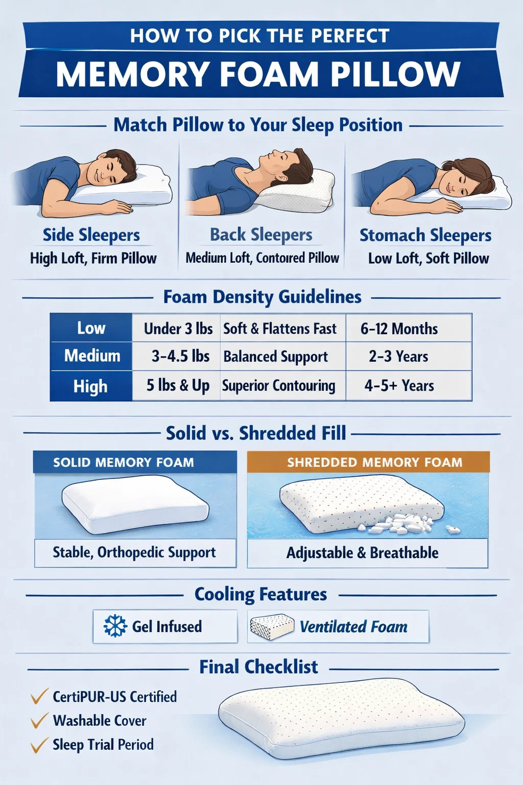 Vybrať si správne vankúš z pamäťovej peny , musíte „podkrovie“ (výška) a „pevnosť“ vankúša prispôsobiť vašej primárnej polohe spánku. Spáči na boku by si mali zvoliť pevný vankúš s vysokým podkrovím, ktorý vyplní medzeru medzi ramenami; spiaci na chrbte potrebujú stredne veľký vankúš s kontúrou krku; a žalúdočné podvaly vyžadujú veľmi tenkú, mäkkú penu alebo strúhanú náplň. Okrem polohy vždy skontrolujte hustota peny (zamerajte sa na 3,5 lb/ft³ alebo viac), aby sa zabezpečila dlhodobá odolnosť a podpora.