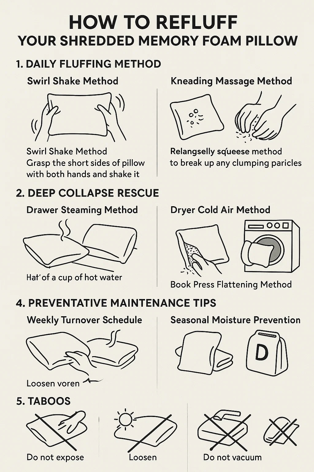Metóda zásuvky: Položte vankúš po rovine do zásuvky s pol šálky horúcej vody v okolí. Zásuvka pevne zatvorte a pomocou vlhkej pary zjemní všetky zhlukové častice. (Odstráňte a potriasť po 20 minútach.)